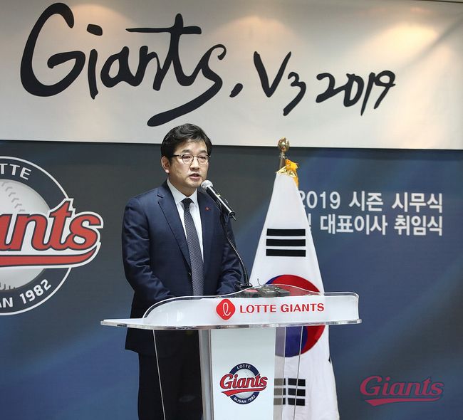 이러한 김 대표이사의 뜻이 담긴 듯, 올해 롯데의 캐치프레이즈는 'One Team Gainst, V3 2019'로 결정했다. 이윤원 단장은 "선수단과, 코치진, 프런트, 팬들 모두 한 마음 한 팀으로 뭉쳐 프로구단의 존재이유이자 목표인 우승을 달성할 수 있도록 하자는 의미에서 정했다"고 밝혔다. /jhrae@osen.co.kr