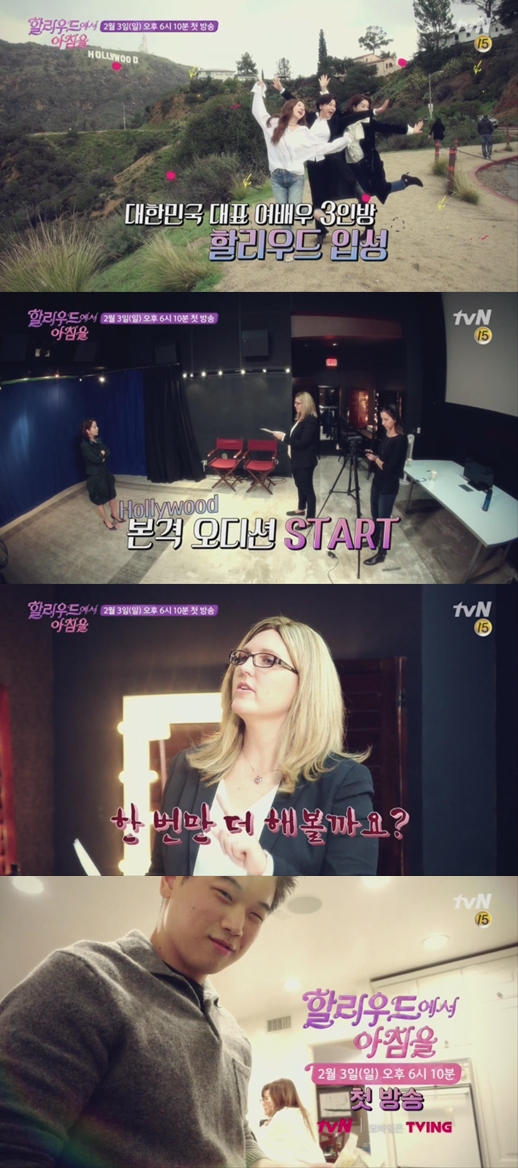 '할리우드에서 아침을' 제작진은 "할리우드에 도전하는 세 배우들의 열정이 대단했다. 베테랑 배우라는 수식어를 완전히 벗어던진 것처럼 오디션 준비에 임했다. 신인 배우 못지않은 적극적인 모습에 제작진도 혀를 내두를 정도였다. 과연 세 배우들이 낯선 할리우드에서 무사히 적응할 수 있을지 많은 기대 부탁드린다"라고 전했다.