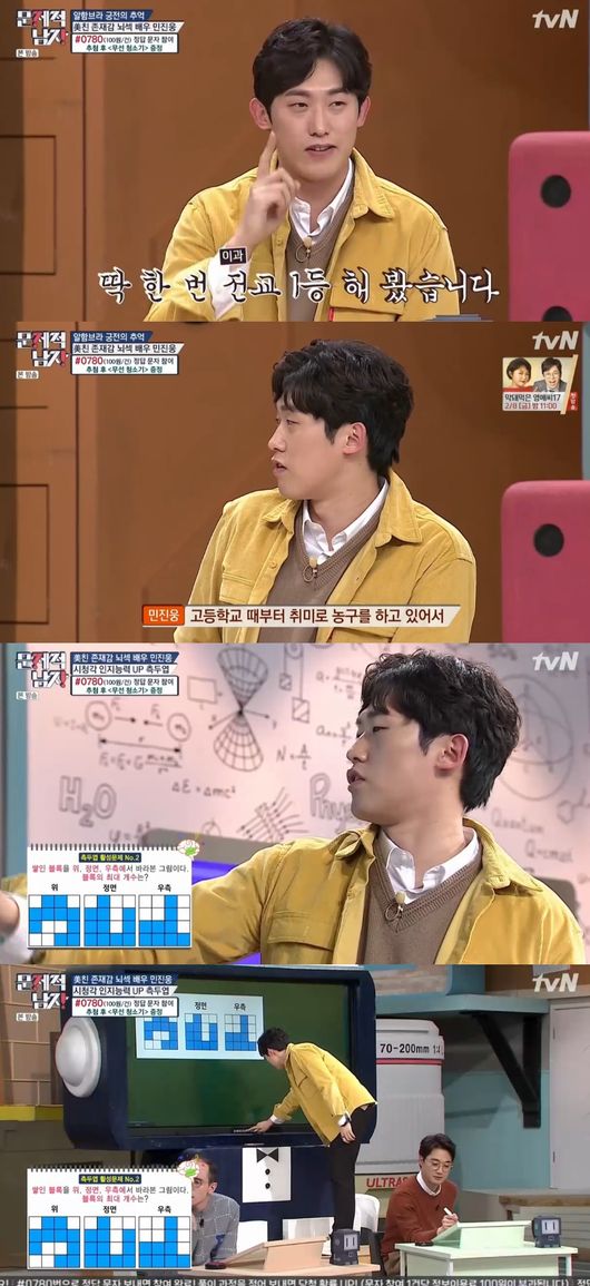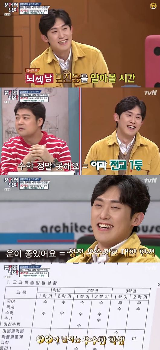민진웅은 '문제적 남자'에 딱 맞는 연예계의 숨겨진 뇌섹남이었다. 고등학교를 다닐 때에는 이과에서 전교 1등까지 한 우등생이었고, 뛰어난 성적을 자랑하며 성적 우수자 전형으로 장학금까지 받고 대학에 진학했다고. 민진웅은 "딱 한 번 전교 1등 해봤다"고 쑥스러워했다.