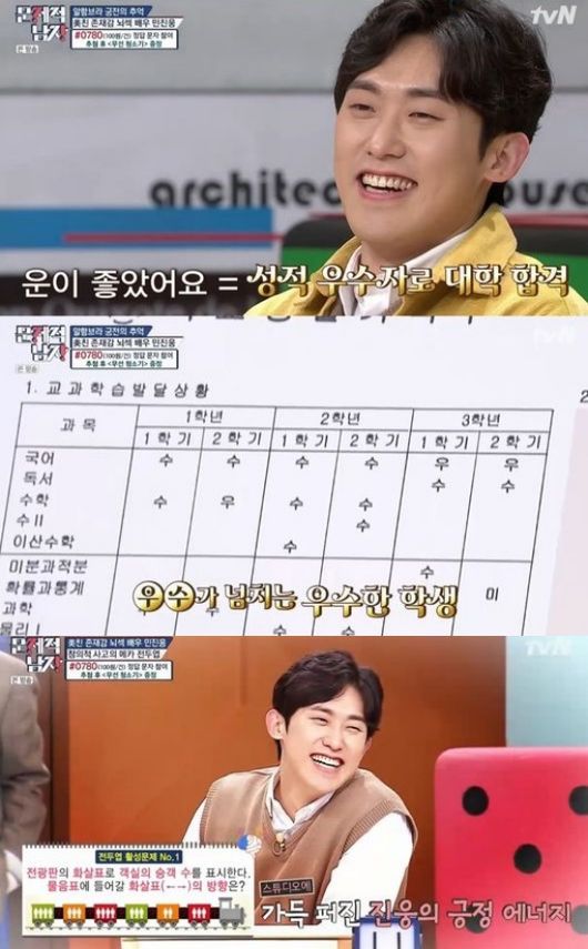 이후 전현무는 민진웅을 "머리 별로 안 좋다고 하더니 고등학교 3년 우등상을 받았고, 수학 못한다고 하더니 이과 1등, 대학은 운이 좋았다고 하더니 성적 우수자 전형으로 장학금까지 받고 입학했다더라"고 소개해 놀라움을 선사했다.