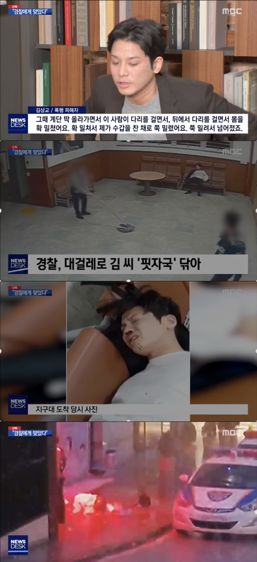 이날 ‘뉴스데스크’에서는 김씨의 사건 당시 CCTV와 체포 직후 순찰차안의 블랙박스 그리고 역사 지구대의 CCTV가 모두 공개됐다. 경찰은 김씨의 주장에 대해서 폭행은 없었다고 맞서고 있다. 경찰은 “김 씨가 출입문 입구에서 혼자 넘어져서 코피가 난 것일 뿐, 김 씨 주장처럼 때린 적은 절대 없다”고 전했다. 또한 경찰은 블랙박스 영상에 대해서도 “시동을 걸면 리셋되는 시간이 50초 정도 있다”고 블랙박스에서 나오지 않는 부분에 대해서 언급했다.