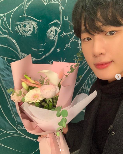 사진 속에서 김동희는 칠판에 그려진 엘사 그림 앞에서 꽃다발을 들고 환하게 미소 짓고 있는 모습이다.
