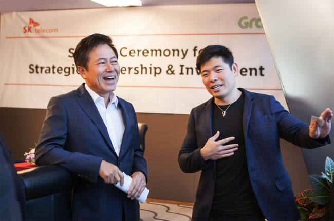 [사진] 박정호 SK텔레콤 대표이사(왼쪽)와 앤서니 탄 그랩 CEO가 협약식에서 밝은 표정으로 이야기를 나누고 있다. /SK텔레콤 제공.