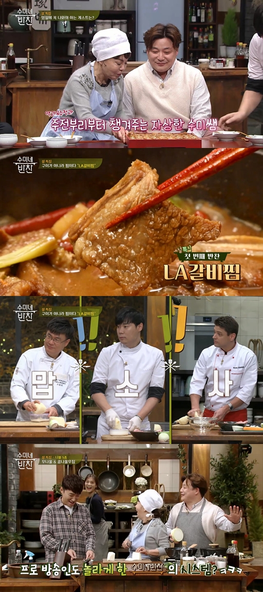 tvN 예능 '수미네 반찬' 설 특집에서 뜯어먹는 재미가 있는 LA갈비찜을 선보인다. 김수미 표 LA갈비찜은 지난해 추석특집에 공개돼 화제를 모았던 갈비찜의 업그레이드 버전으로, 일반 갈비보다 얇은 LA갈비를 사용해 시간 절약은 물론 저렴한 가격으로 맛볼 수 있다는 설명이다.