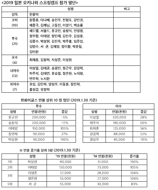 한편 한화는 31일 오전 9시40분 인천국제공항(OZ172편)을 통해 스프링캠프가 차려진 일본 오키나와로 출국한다. 한용덕 감독을 필두로 코칭스태프 11명, 투수 21명, 포수 4명, 내야수 12명, 외야수 7명 등 55명 규모다.