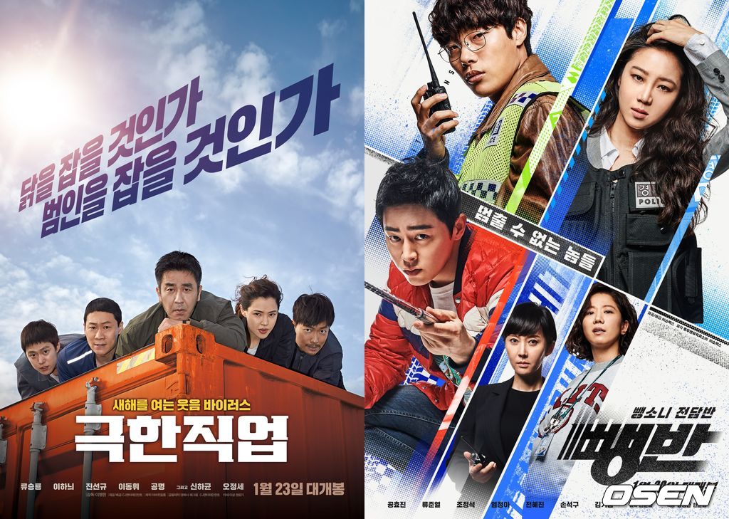‘극한직업’과 ‘뺑반’이 각각 박스오피스 1, 2위를 차지하며 본격적인 설 연휴를 앞두고 흥행을 이끌고 있는 것으로 보인다. '극한직업'은 해체 위기의 마약반 5인방이 범죄조직 소탕을 위해 위장 창업한 치킨집에서 벌어지는 이야기를 담은 코믹 수사극이고, ‘뺑반’은 통제불능 스피드광 사업가를 쫓는 뺑소니 전담반 ‘뺑반’의 고군분투 활약을 그린 범죄오락액션 영화로 두 영화의 색깔은 다르다.