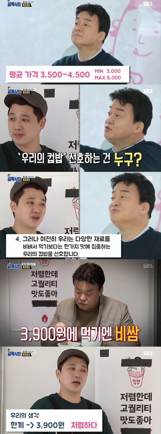 이를 듣고 있던 백종원은 "'나 안'에만 갇혀 있다. 대중의 인식은 컵밥 하면 노량진 컵밥이다. 컵밥을 준비하려면 아무리 다른 컵밥이어도 주류 컵밥 연구를 했어야 했다"면서 "비교 대상인 노량진 컵밥은 2~3가지 이상 재료에 3000원대다. 알맹이 있는 반찬이 3개 이상인데 여기 메뉴는 알맹이 있는 게 1개만 들어갔는데 가격이 비싸다. 제가 걱정하는 건 대중이 아닌 사장님들 눈높이로 보고 있다"라고 일침 했다.