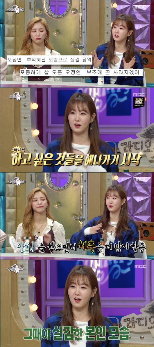 오정연은 살이 찐 이유에 대해서 힘든 시기를 지나 행복해져서 였다고 털어놨다. 오정연은 “과일 주스 가게 아르바이트를 하면서 남은 주스를 먹으면서 살이 쪘다. 1년 동안 힘든 시기를 보내면서 식욕도 감퇴하면서 6kg가량 빠졌다. 그 시기를 지나고 행복해지니까 식욕이 확 늘었다”고 털어놨다. 오정연은 이날 ‘라스’ 출연 당시에도 확 찐 사진보다 1.8kg 가량 몸무게가 더 나가는 상태라고 설명했다.