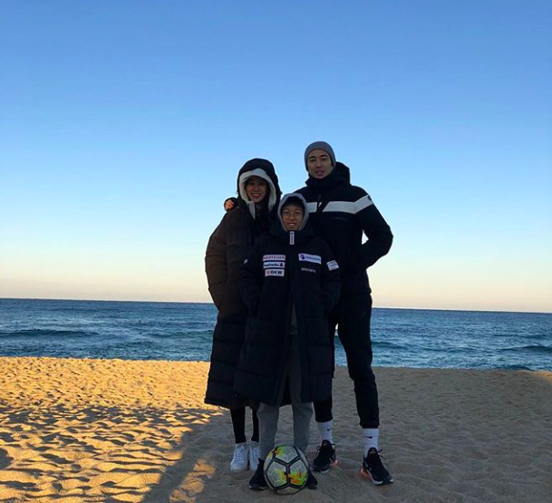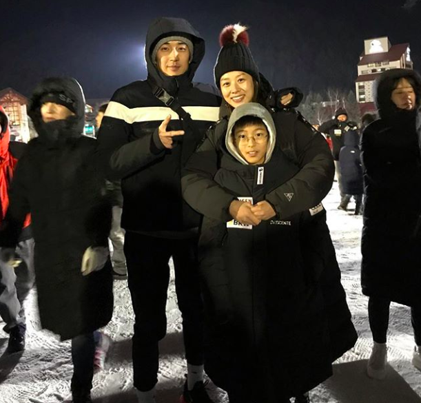 공개된 사진 속 강경준은 바다를 배경으로 장신영, 아들 정안 군과 함께 행복하게 포즈를 취하고 있다. 이들의 얼굴엔 미소가 한가득이다.