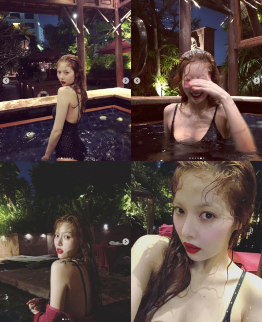 가수 현아가 수영복을 입고 늘씬한 몸매를 공개했다.