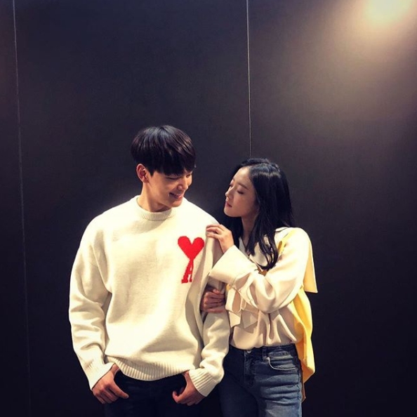 사진 속 이세영은 여진구의 옆에서 다정하게 팔짱을 끼고 있으며, 여진구도 이세영 쪽으로 얼굴에 돌려 미소를 짓고 있다.