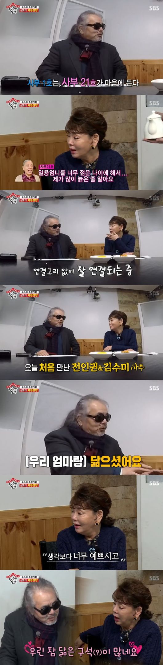 이때, 전인권이 전화를 수그리고 받으며 김수미 앞에서 어려워하자, 김수미는 "나 안 어려워요"라며 애교폭발, 전인권은 눈도 못 마주치고 쑥스러워했다. 전인권은 "나를 끌고가실 분 이상형"이라고 했고, 김수미는 "나는 안 돼에에에, 지금 호정정리하면 복잡해"라고 말해 배꼽을 잡게 했다.