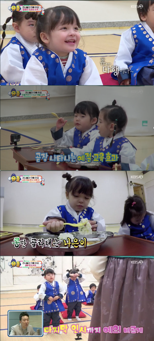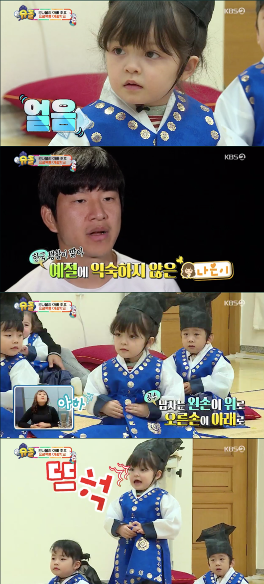 지난 3일 오후 방송된 KBS 2TV ‘슈퍼맨이 돌아왔다’에서 박나은과 박건후는 아빠 박주호와 함께 예절교육을 받았다.