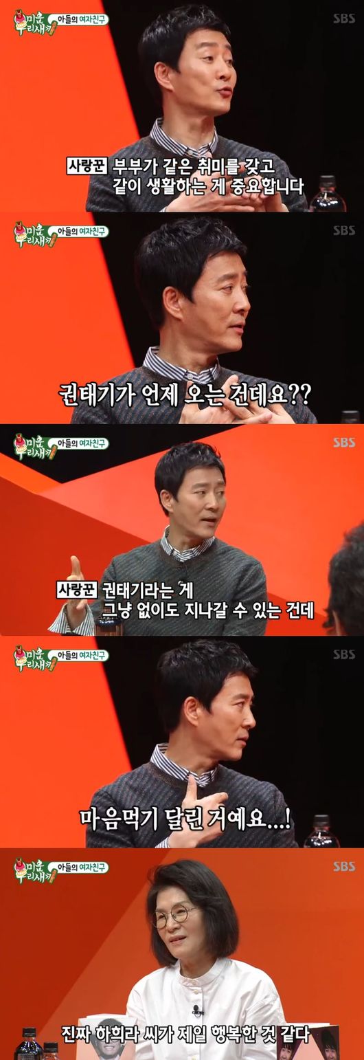 "같은 취미로 같이 생활하는 것 중요하다"고 했다. 이어 "흔히들 한 번쯤 권태기를 겪는데 권택기가 있던 적 있냐"고 질문, 최수종은 "권태기가 언제 오는 건데요?"라고 되물으면서 "권태기라는게 그냥 지나갈 수 있기 마련, 마음먹기 달린 것"이라 했고, 母들은 "하희라씨가 제일 행복한 것 같다"며 부러워했다.