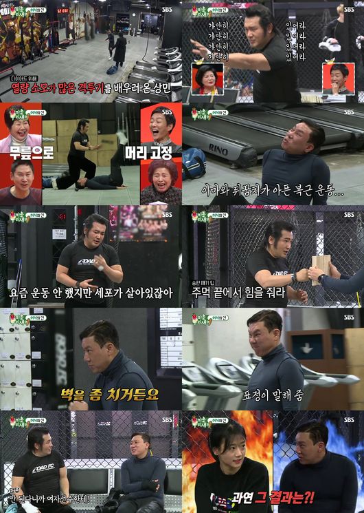 상민과 기초 운동에 들어간 김보성은 다리잡기에서부터 “통통통” 옆으로 몸이 이동, 균형을 잡지 못하는 ‘허당美’를 선보였다. 이를 지켜본 母벤져스는 “허세의 끝판왕이 왔다”며 웃음을 참지못했다. 하지만 누워서 다리 올리기, 송판 격파 등 이어지는 운동에서는 김보성의 식지 않은 ‘파워’도 엿볼 수 있었다. 이에 김보성은 “요즘 운동은 안했지만 세포가 살아있잖아”라며 다시금 ‘허세’를 부렸다. 이에 질세라 이상민은 “(저도) 벽을 좀 치거든요”라며“ 송판 7개 깨기에 도전했으나 주먹이 깨지는 고통만 맛봤다. 다음 주에는 체급이 낮은 프로여선수와 격투기 스파링도 예고돼 한층 기대감을 더했다.