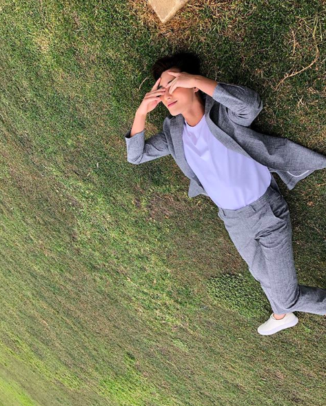 이날 그가 공개한 사진을 보면, 잔디밭에 누워 있는 박서준이 부끄러운 듯 양손으로 눈을 가리며 미소짓고 있다.