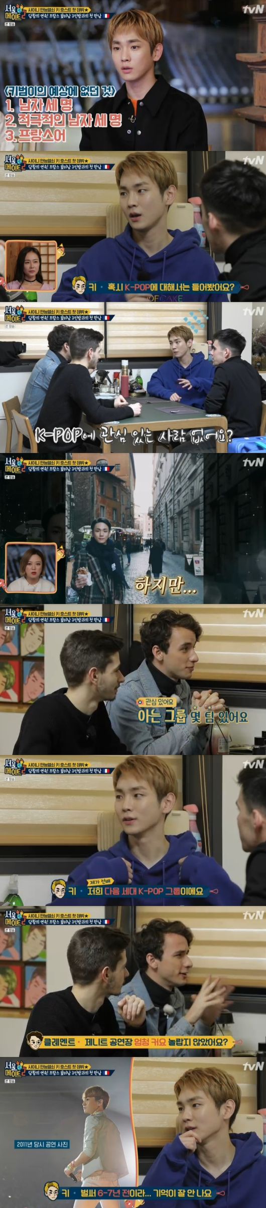 이어 직업을 소개, 세 사람은 키를 못 알아봤다. 키는 자신이 가수임을 소개하면서 "K팝 관련일로 파리에 자주갔다"고 했다. 세 사람은 "아는 그룹 있다"고 했고, 키가 BTS를 질문, 세 사람은 " BTS는 안다"고 말해 굴욕을 안겼다. 키는 당황하지 않고 "K팝 우리 다음 세대"라며 자신이 선배임을 전했다.