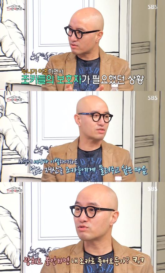 홍석천은 "저는 조카가 둘이다. 저한테는 자식들이다. 누나가 이혼하면서 아이들의 보호자가 필요했기 때문에 제 호적에 입양을 했다"며 "제가 결혼할 사람은 아니지 않나. 나중에 하늘나라 갈 때 남겨진 재산들을 누구한테 줘야 하는데 조카들에게 주기로 했다"고 말했다.