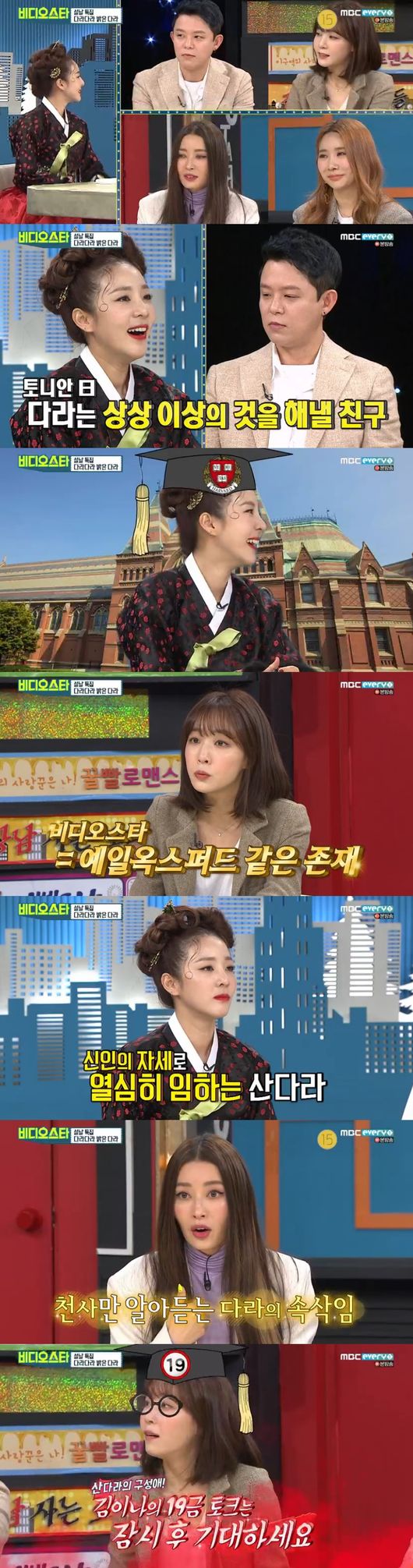 5일 방송된 MBC 에브리원 예능 '비디오스타'에서 산다라 절친특집으로 토니안, 김이나, 황보, 제아가 출연했다.