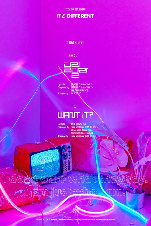 JYP엔터테인먼트(이하 JYP)는 6일 0시 자사 SNS 채널 및 ITZY 공식 홈페이지에 핑크빛 오브제들과 네온사인이 눈길을 끄는 ITZY 데뷔 앨범 'IT'z Different'의 트랙리스트 이미지를 공개했다. 트랙리스트에 따르면 'IT'z Different'에는 타이틀곡 '달라달라'와 수록곡 'WANT IT?'이 담긴다.