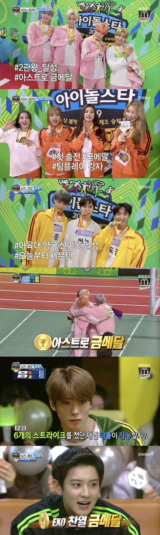 그룹 아이즈원과 아스트로가 400m 릴레이 경기에서 금메달을 차지했다.