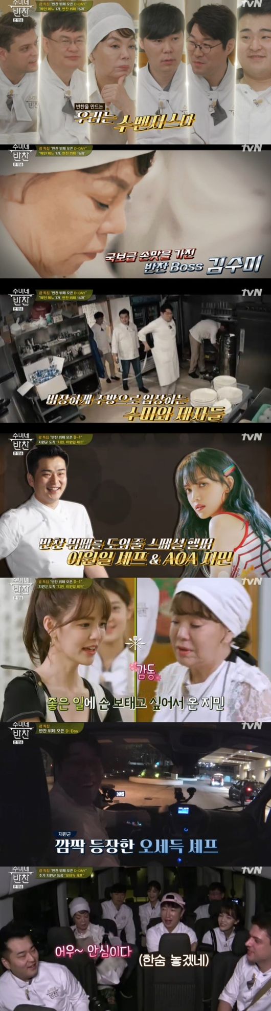 재료를 손질하는 사이, 이원일 세프와 AOA 멤버 지민이 일일 도우미로 깜짝 등장했다. 지민은 "좋은 일에 손을 보태러 왔다"며 인사했고, 일손이 부족한 때에 모두 반갑게 맞이했다. 걱정하던 찰나, 식재료 컨테이너도 도착했다. 모두 바쁘게 필요했던 식재료들을 주방으로 옮겼다. 하지만 엎친 데 덮친 격으로, 냉동된 식재료들에 다시 브레이크가 걸렸다. 요리를 위해 해동이 시급한 상황, 최대한 할 수 있는 것과 없는 것을 나눠 지체됐던 속도를 올렸다. 김수미도 다시 기력을 회복해 반찬 만들기에 힘을 실었다.