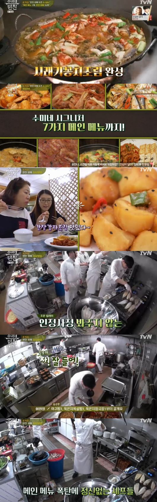 본격적으로 회의를 시작, 아귀찜, 묵은지 청국장, 시래기 꽁치조림, 우렁 된장찌개, 닭볶음탕, 묵은지 목살찜 등 메인메뉴만 7가지였다. 셰프들은 메뉴를 분산시키자고 했다. 하지만 김수미는 "다 맛보게 할 것"이라면서 엄마마음을 보였다. 반찬 뷔페에 걸맞게 기본 반찬도 16가지나 제공할 것이라고 했다. 하지만 당일에 하기엔 쉽지 않은 수량이었다. 의견이 조율되기 쉽지 않았지만, 김수미 뜻대로 결국 메인메뉴 4가지와 반찬 16가지를 확정했다. 요리계 큰 손 김수미의 스케일이었다.
