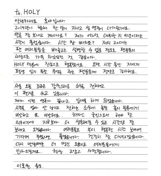 지난 2017년 인피니트를 떠나 솔로 가수와 배우로 활동하고 있는 이호원은 지난 5일 자신의 팬카페를 통해 자필편지로 입대 소식을 알렸다. 그는 "제가 이번 연휴가 끝나고 입대를 하게 되었습니다. 시간을 얼마 안 남기고 전하는 소식에 놀랄 홀리 분들에게 미안하고 또 미안해요. 하지만 국민으로서 해야 할 의무이기에 지금보다 더 성숙해질 수 있는 시간으로 잘 보내고 오겠습니다"라고 팬들에게 인사를 남겼다.