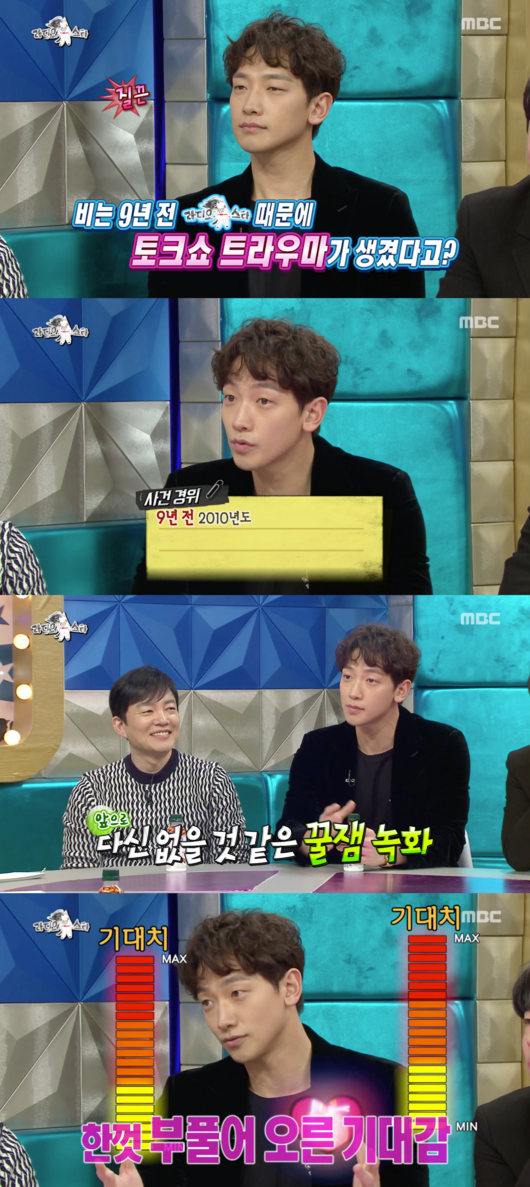 또한 비는 9년 전 '라디오스타' 5분 굴욕 사건에 대해서도 허심탄회하게 이야기 했다. 그는 '라디오스타' 때문에 토크쇼 트라우마가 생겼다며 "라디오스타에서 무릎팍도사는 하고 왜 이건 안하냐고 해서 출연했다. 녹화도 재밌게 잘 했다. 이렇게 재미있을 수가 있나 싶을 정도였다. 한껏 기대를 했다. 굉장한 이슈가 되겠다 싶었다"고 당시를 회상했다.