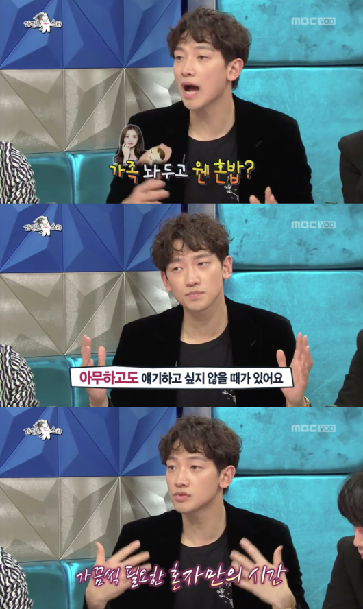 비는 김태희의 의견에 전적으로 동의하는 편이라며 내 의견은 없지만 그게 편하다고 아내에 대한 애정을 드러냈따. 하지만 종종 혼밥을 한다고 밝혀 의아함을 자아낸 비는 "아무에게도 이야기하고 싶지 않을 때가 있다. 고민에 빠져있거나, 나를 리프레시 하고 싶을 때가 있다"며 "혼밥에도 단계가 있다. 패스트푸드와 편의점은 초급이다. 최근 고깃집에 혼자 가는 것까지 달성했다. 며칠 전에도 다녀왔다"라고 설명했다.