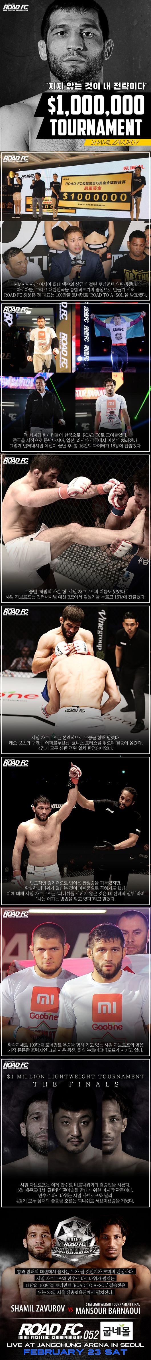 격투기 팬들의 관심이 모아지고 있는 100만불 토너먼트 ‘ROAD TO A-SOL’의 결승전이 오는 23일 서울 장충체육관에서 열리는 굽네몰 ROAD FC 052에서 펼쳐진다. 결승에는 ‘하빕의 사촌 형’ 샤밀 자브로프(35, AKHMAT FIGHT CLUB)와 만수르 바르나위(27, TEAM MAGNUM/TRISTAR GYM)의 이름이 올라있다. 결승전에서 승리를 거둬야 5월 제주도에서 ‘끝판왕’ 권아솔(33, 팀 코리아 MMA)과 마주할 수 있다.