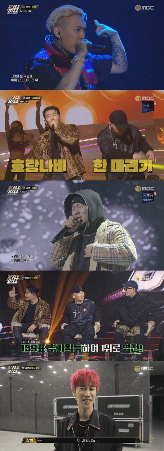이처럼 폭풍 같은 무대가 이어진 ‘킬빌’은 예상치 못한 1차 경연 순위로 마지막까지 긴장을 놓을 수 없게 만들었다. 100초간 공개됐던 실시간 투표 결과와는 달리 리듬파워가 1등을 거머쥐며 새로운 복병으로 떠오르게 된 것. 더불어 최하위 등수를 받은 산이가 ‘킬빌’의 첫 탈락자로 발표 돼 안방극장을 충격으로 물들였다.