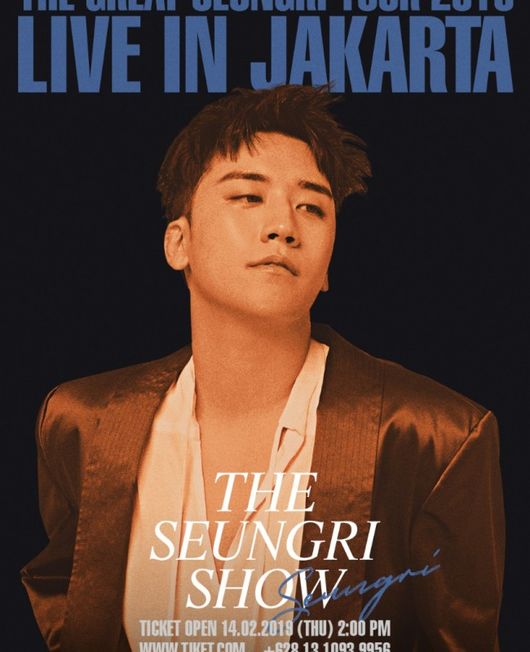 포스터 속에는 'THE GREAT SEUNGRI TOUR 2019 LIVE IN JAKARTA-THE SEUNGRI SHOW’라는 문구와 함께 화려한 외모를 자랑하는 승리의 모습이 담겨있다. 이번 공연은 3월 17일(일) 오후 7시 라이브스페이스(LIVESPACE LOT8)에서 개최한다.