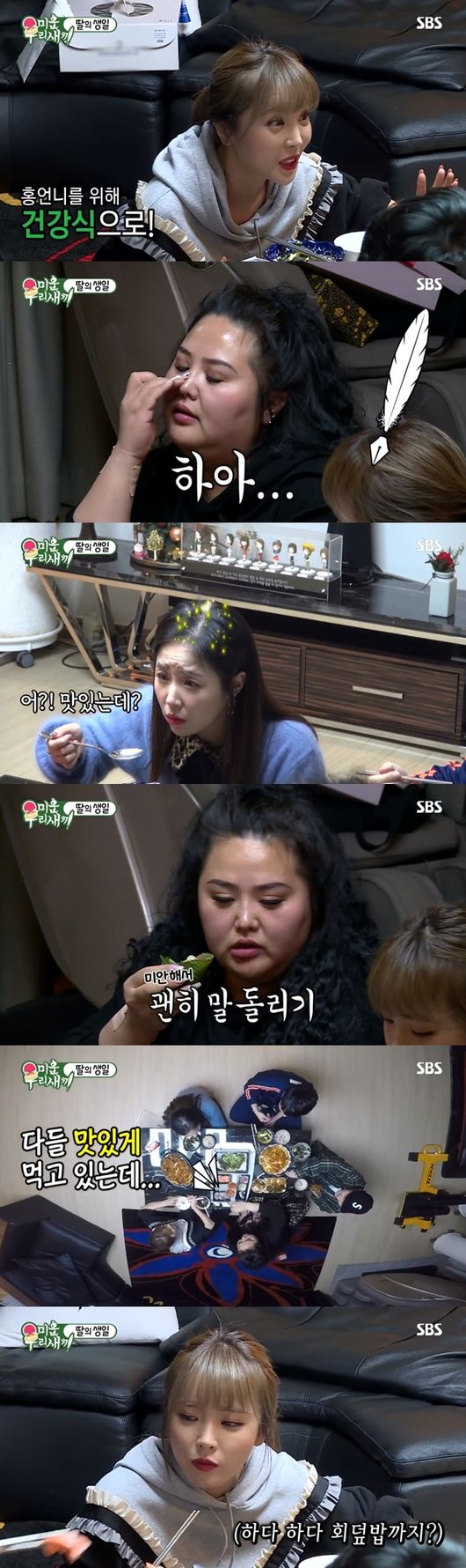 하지만 홍선영의 반응은 좋지 않았다. 그는 "미역국엔 소고기"라며 홍진영의 닭가슴살 미역국을 탐탁치 않아 했다. 또 홍선영은 두부 잡채를 두고 "잡채에 대한 예의가 아니다"라면서 불만을 표했다.