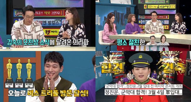 한편 이날 정진운이 군 입대를 앞두고 91라인 절친들과 함께 ‘비디오스타’ 나들이에 나섰다. 앞서 정진운은 춤신춤왕, 공개연애 등 굵직한 이슈로 ‘비디오스타’를 두 차례나 방문했는데, 이번이 세 번째 방문이니만큼 여느 때보다 물오른 예능감을 보여주며 촬영에 임했다. 또한 이번 촬영에서 그는 절친들과 함께 출연하여 서로간의 폭로 열전으로 녹화장을 웃음바다로 만들었다는 후문이다.