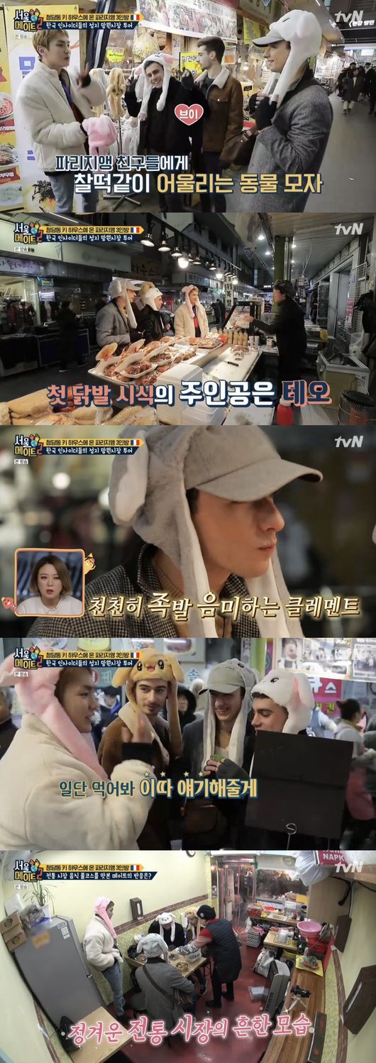 '인싸템' 토끼모자를 하나씩 장착한 네 사람은 본격적으로 시장 투어에 나섰다. 닭발부터 족발, 홍어무침, 꼬마김밥, 어묵, 식혜까지 다양한 시장 음식을 맛본 메이트들은 모두 맛있다며 감탄했다.