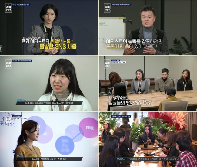 스트레이 키즈의 2019년을 컨설팅해 스트레이 키즈 멤버들과 박진영의 칭찬을 받았던 위정은, 최지은, 원동인, 강하윤은 자신들이 좋아하고 잘하는 것들을 발표에 녹여내 다른 팀들보다도 경쟁력 있는 컨설팅 발표를 준비했다. 특히 스트레이 키즈의 팬이라고 밝힌 강하윤은 팬으로서 아티스트의 장점과 아쉬운 점, 그리고 그룹의 서사까지 깊이 있게 파악하고 있었고, 이를 바탕으로 아티스트를 공부해서 파악한 다른 팀들보다 더욱 풍부하고 와 닿는 발표 내용을 준비해 첫 번째 ‘슈퍼인턴’의 영광을 안았다. 이처럼 엔터 업계를 향한 열정과 애정을 갖춘 인턴들이 각 과제마다 보여줄 활약상에 관심이 쏠린다.