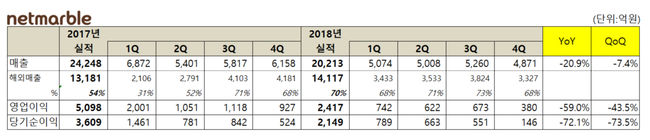 4분기 매출 중 해외매출 비중은 68%(3,327억원)를 기록했다. ‘리니지2 레볼루션'을 비롯해 ‘마블 퓨쳐파이트', ‘마블 콘테스트 오브 챔피언즈’, ‘쿠키잼’ 등이 북미, 일본 시장에서 꾸준한 성과를 냈다.