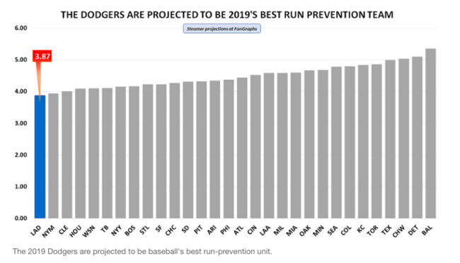MLB.com은 14일(이하 한국시간) “6년 연속 내셔널리그 서부지구 우승을 차지한 다저스는 2019시즌에도 손쉽게 지구 우승을 차지할 것이다”며 “통계 예측 시스템으로 분석한 결과, 다저스는 경기당 3.87점을 허용하며 최고의 ‘득점 방지(run-prevention)’ 팀이 될 것이다. 메이저리그 30개 구단 중 최소 실점이다”고 설명했다.