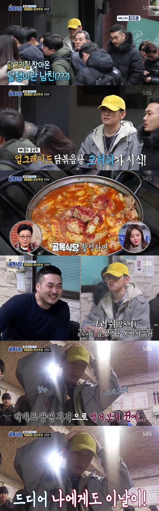 한편, 크러쉬가 닭볶음탕 마니아라며 닭요릿집을 직접 찾은 모습이 그려졌다. 골목식당 애청자는 물론 백종원의 팬이라고 했다. 크러쉬가 30분 기다린 끝에 식당에 입장했다. 크러쉬는 첫회 지적한 사항까지 모두 알면서 본방사수한 모습이 그려졌다. 이어 음식을 영접, 원샷으로 카메라를 잡았다. 이어 "진짜 맛있다"며 맛에 감탄했다.크러쉬는 "엄마가 떡볶이 해준 맛이 생각난다"며 추억속의 맛이라 평가했다. 국물을 마시며 "WOW"만 외치면서 "진짜 거짓말이 아니다, 국물이 정말 깊다, 국물이 미쳤다"며 먹방에 빠졌다. 달달하면서 얼큰한 맛이라고. 급기야 낮술 분위기까지 이어가 웃음을 안겼다. 크러쉬는 "낮술을 6년만에 먹는 것 같다"면서 6년만에 낮술을 봉인해제 시킬 정도로 끝판왕이라고 했다.