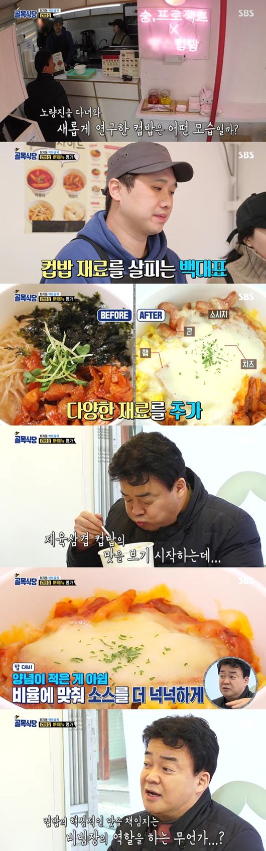 백종원은 컵밥 재료를 살피더니 제육삼겹 컵밥부터 시식했다. 이어 "일단 지난번 보단 훨씬 낫다"면서 다음은 치즈불닭을 시식했다. 백종원은 치즈불닭이 제육보다 낫다고 말했다. 마지막 순서인 치킨 참치마요를 시식, 각각 다른 조합으로 맛을 보며 음미했다. 이어 "이것도 맛있다"며 호평, 다양한 재료가 있어 조합할 수록 새로운 맛들이 나온다고 했다. 열심히 메뉴 연구를 해 얻은 결실이었다. 하지만 제육덮밥은 아쉬운 맛이 남았다. 백종원은 "가지'"를 외치며 핵심의 대표 메뉴를 채우기 위해 직접 나서는 모습이 그려졌다.