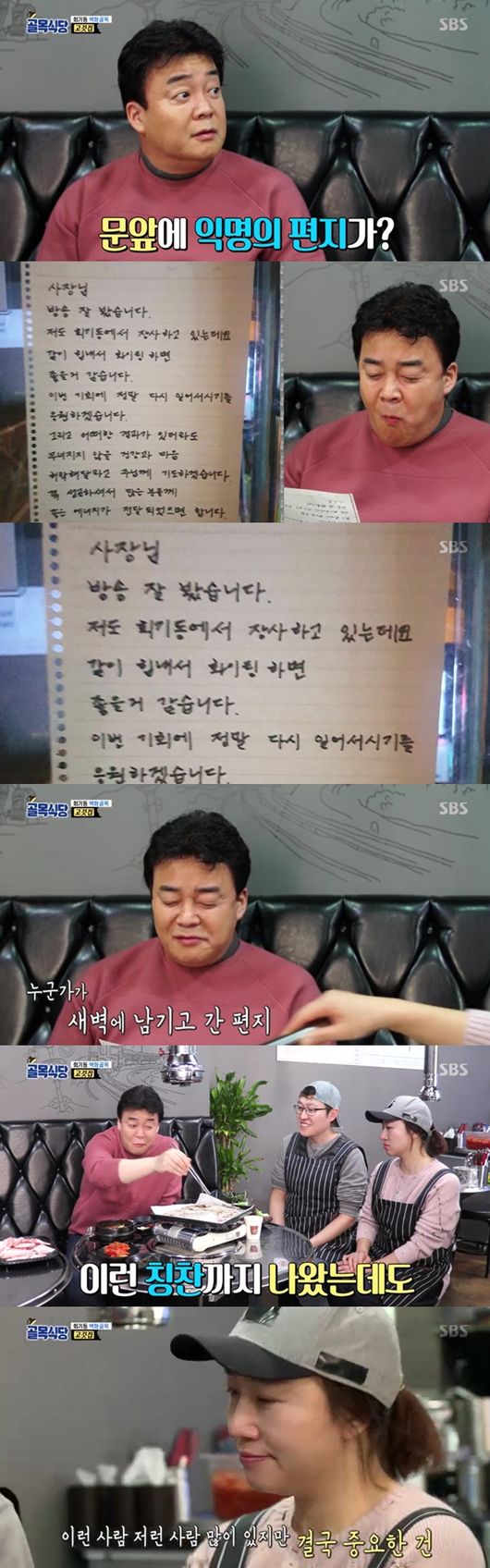 그리곤 문 앞에 장문의 편지가 있었다고 했다. 회기동에서 함께 장사하는 한 익명의 편지였다. 힘내서 함께 장사하자며 응원의 글이 적혀있었다. 다른 가게 사장들도 힘내라고 응원해준다며 따뜻한 마음들을 나눴다. 백종원은 "이런저런 사람들 많이 많지만 결국 중요한 건, 좋은 음식, 좋은 가격에 팔면 그걸로 족한 것"이라 위로했다.