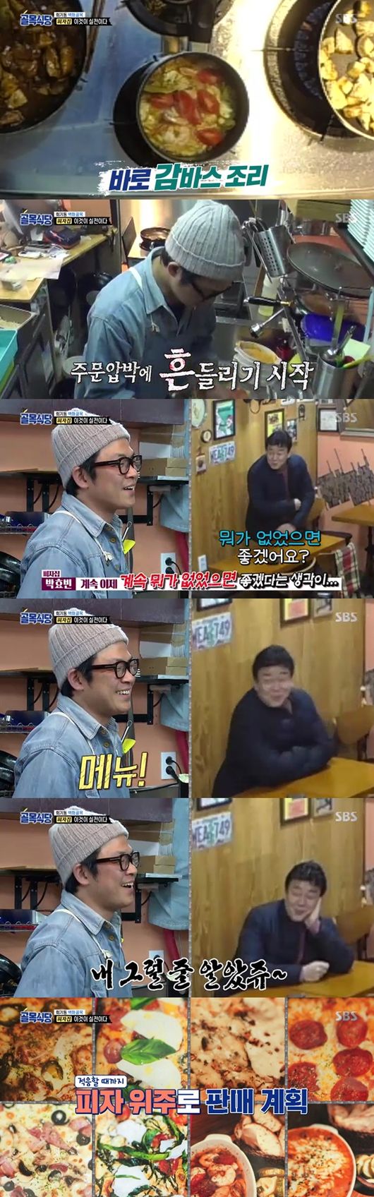 실제로 겪으니 또 달랐던 장사, 사장은 재료소진으로 50명까지만 주문을 받았다고 했다. 첫 손님들 입장하자마자 서둘러 재료와 손님들을 파악해 대기줄을 정리했던 것이다. 백종원이 찾아왔고 어땠는지 물었다. 사장은 백종원의 처음 말대로, 메뉴를 정리해야할 것을 직접 느끼며 고민에 빠졌다. 사장은 "피자만 하겠다"고 드디어 결심, 백종원은 결심을 믿으며 자신이 생각했던 피자연구를 해보자고 했다. 첫번째 소고기 토핑부터 시작, 백종원은 사장에게 "이것저것 다 해보자"며 의견들을 물었고, 사장도 적극적으로 의견을 제시, 반반피자 조각까지 탄생됐다. 특히 게살과 새우 반반인 피자에 크림소스까지 더해진 맛은 모두 감탄했다. 백종원은 "무궁무진한 피자의 맛, 반반피자가 골라먹는 재미가 있을 것"이라면서 "이런식으로 한 조각에 두가지 맛을 주문할 수 있는 것이 좋겠다"고 제안했다.