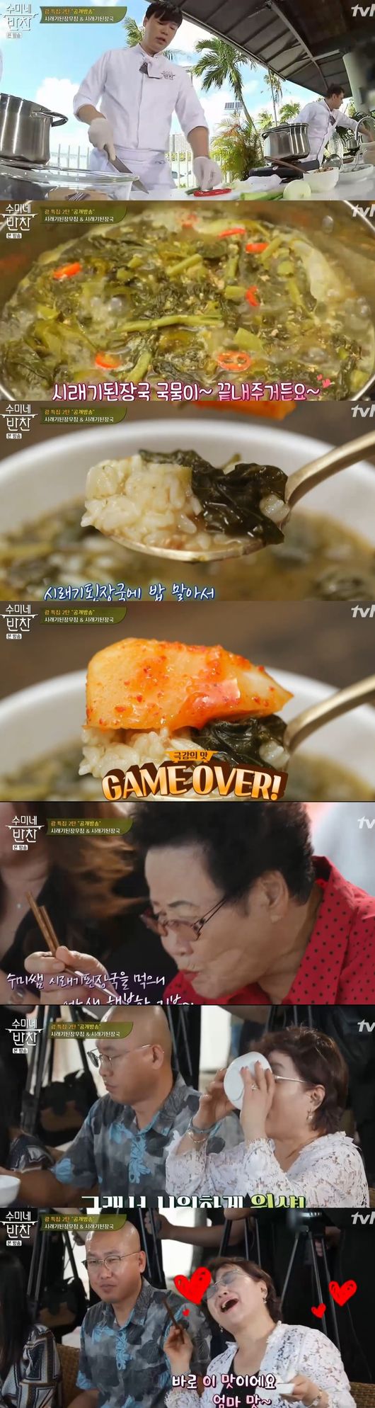 시래기된장국이 완성됐다. 장동민이 "괌 바닷바람보다 시래기된장국이 더 시원하다"고 말했다. 교민들도 그릇채 다 비웠다. 김수미는 "빈 빈그릇을 볼 때가 정말 행복하다"며 미소를 지었다.