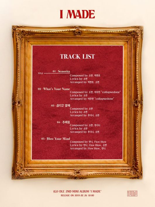 (여자)아이들은 14일 0시 공식 SNS를 통해 오는 26일 발매되는 미니 2집 'I made'의 트랙리스트를 공개했다.