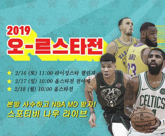 ‘코피 듀오’가 현지에서 중계하는 2019 NBA 올스타전 전야제는 스킬스 챌린지, 3점슛 컨테스트, 덩크 컨테스트 등으로 꾸며지며, 오는 17일 일요일 오전 10시부터 스포티비(SPOTV), 스포티비 온(SPOTV ON), 스포티비 나우(SPOTV NOW)에서 생중계된다. 토요일 오전 10시 열리는 라이징스타 챌린지 또한 같은 채널에서 시청 가능하며, 18일 오전 11시 올스타전 경기는 스포티비2(SPOTV2), 스포티비 온2(SPOTV ON2), 스포티비 나우(SPOTV NOW)에서 방송된다.