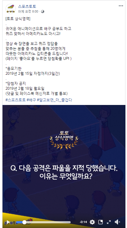 ‘배구 규칙 공부하고, 퀴즈도 맞혀서 아메리카노 기프티콘 받아가세요~!’