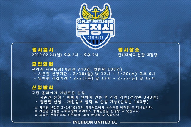 인천유나이티드가 오는 24일 인하대학교 본관 대강당서 2019시즌 개막 기념 출정식 행사를 개최한다.