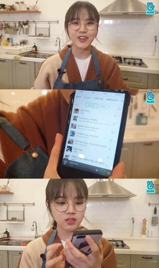 이날 김향기는 머핀 반죽을 오븐에 넣은 후 팬들과 소통의 시간을 가졌다. ‘요즘 노래 뭐 듣냐?’는 질문에는 “제가 항상 브이라이브를 할 때마다 요즘 뭐 듣는지 알려드리고 있는데 저 이제 음악 듣는 어플에서 19세 음악도 마음껏 들을 수 있더라. 원래 못 들었는데… 저 일리네어 팬인 거 아시냐. 조용필 선생님의 ‘창밖이 여자’, 빈지노의 ‘미쳤어’, ‘프로파일’ 등을 듣는다”고 밝혔다.