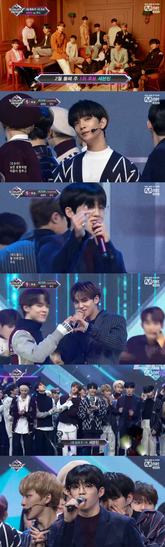 14일 오후 6시, 생방송으로 진행된 Mnet ‘엠카운트다운’에서 세븐틴이 ‘홈’으로 ‘이 노래가 클럽에서 나온다면’의 우디를 꺾고 2월 둘째 주 1위를 차지했다. 이로써 세븐틴은 데뷔 이래 처음으로 ‘엠카운트다운’ 3주 연속 1위를 달성, 크리플 트라운 영예를 안았다. 세븐틴 멤버들은 오늘이 팬클럽 캐럿들의 생일이라며 ‘홈’을 생일 축하 버전으로 소화했다.